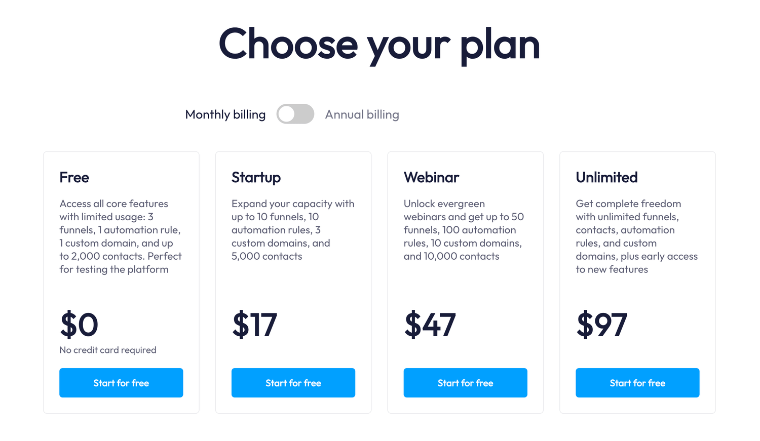 Systeme.io keeps it simple with four plans: Free, Startup, Webinar, and Unlimited. Here's the current breakdown: